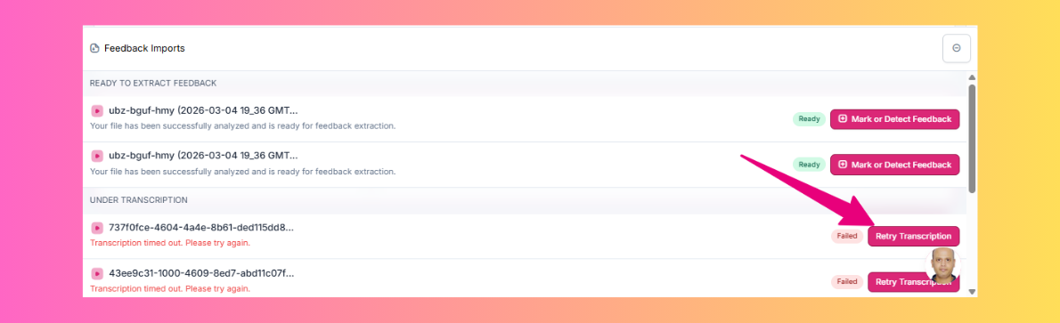 If a transcription fails or times out, you can simply retry it and continue extracting feedback without starting over.